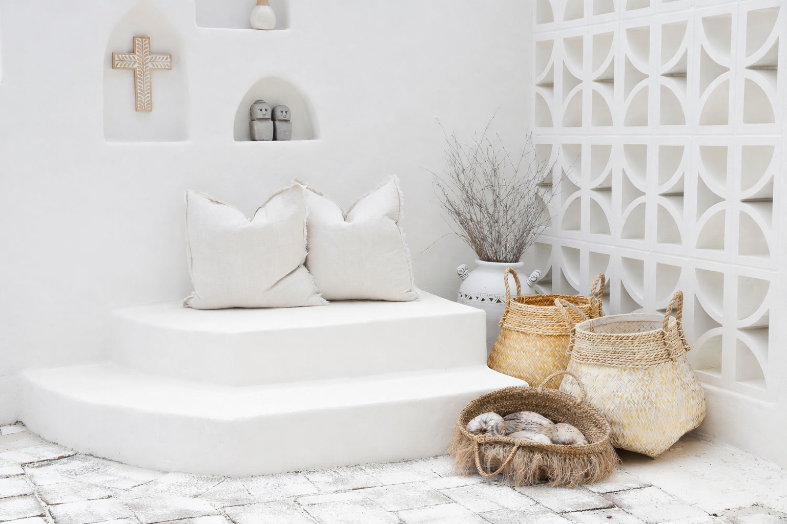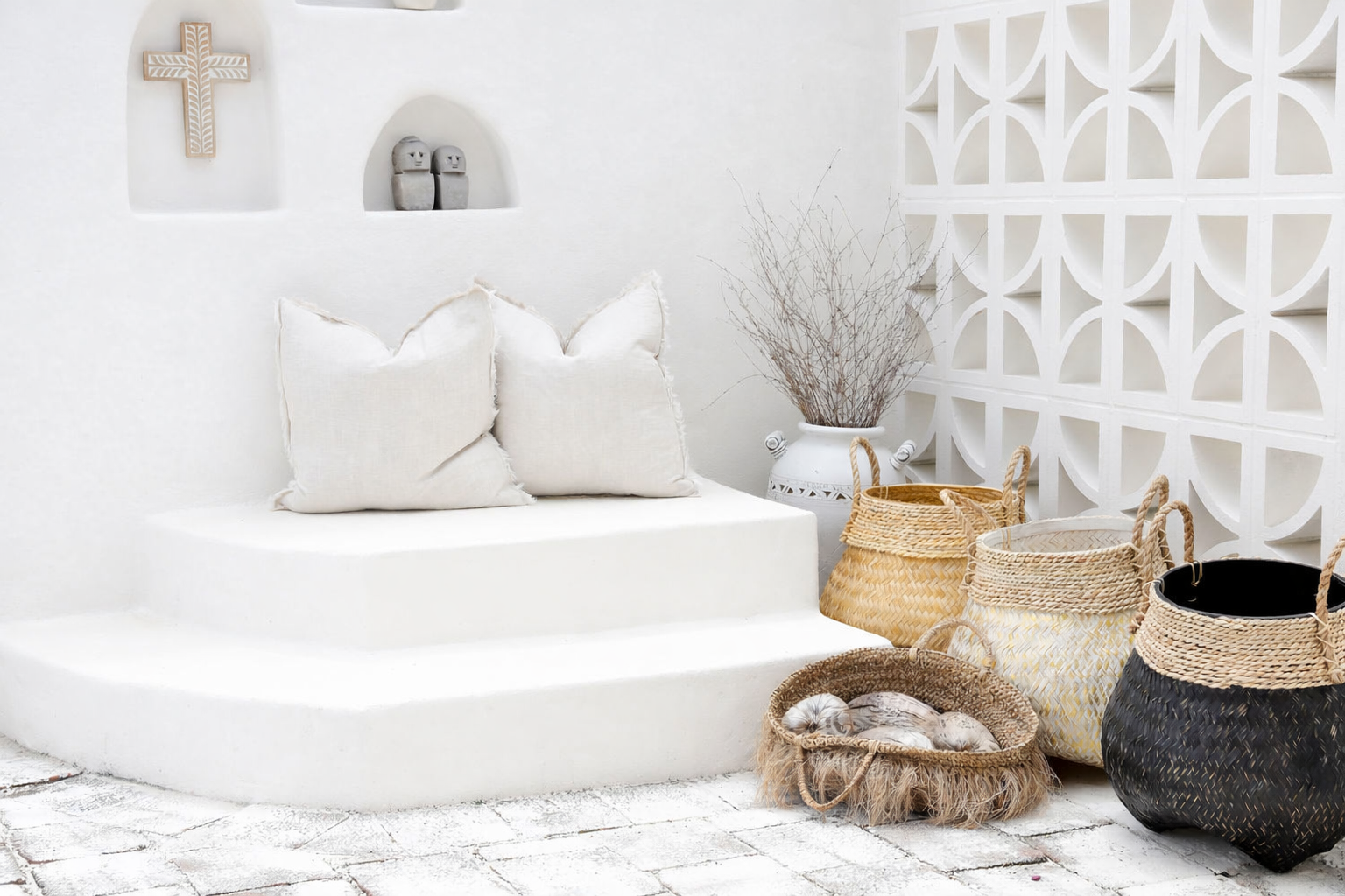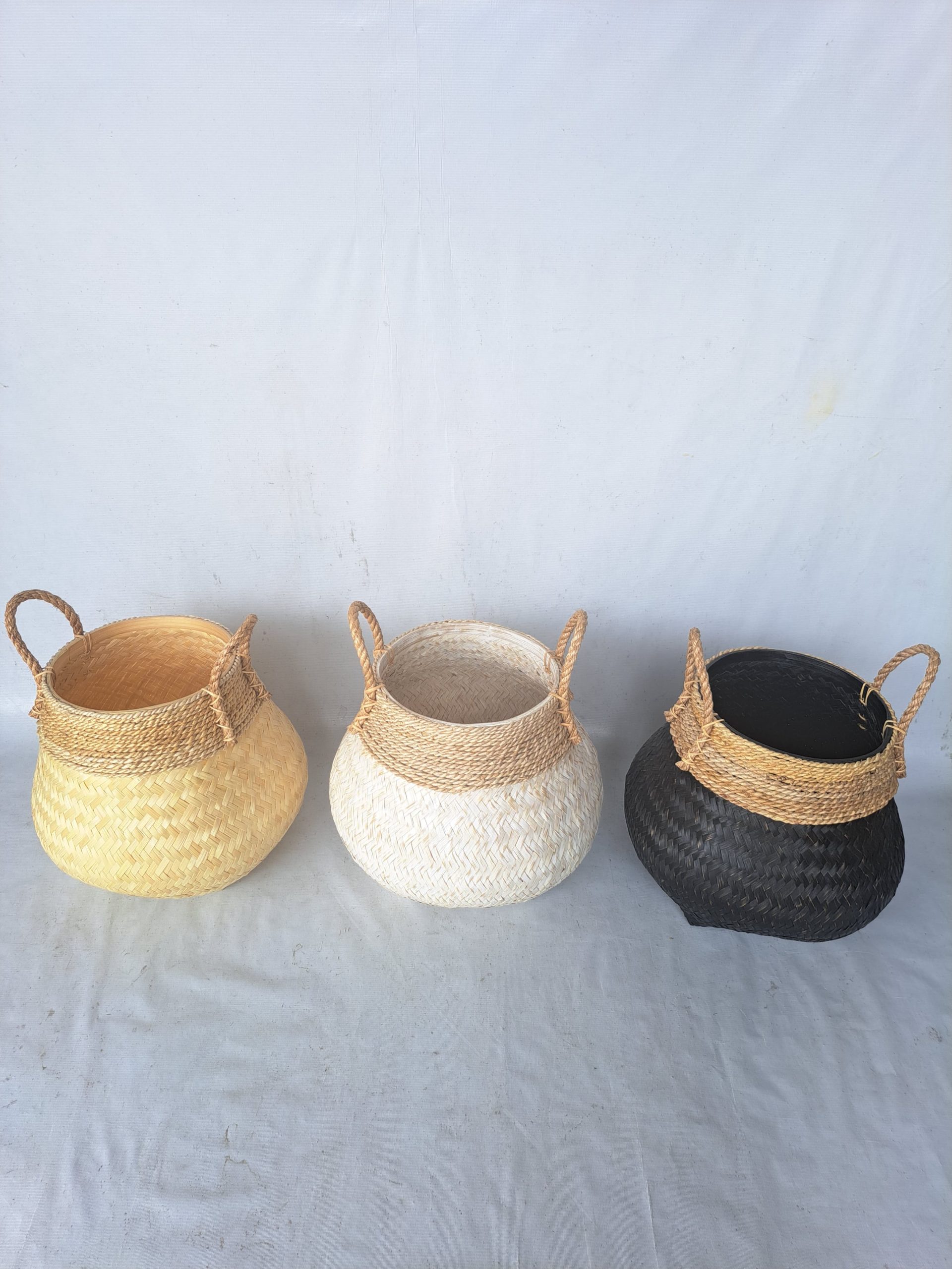 These natural baskets of carefully woven bamboo and seagrass are the perfect, light decorative pieces to complement your coast home. Each is a circular basket with a bamboo woven design in either white/gold, natural or black, contrasted with horizontal weaving around the top and handles. These lovely baskets are perfect for use as a plant baskets, or as a decorative piece in a living room, bedroom or covered outdoor area. Will work with any decor to add a lightness to your space.