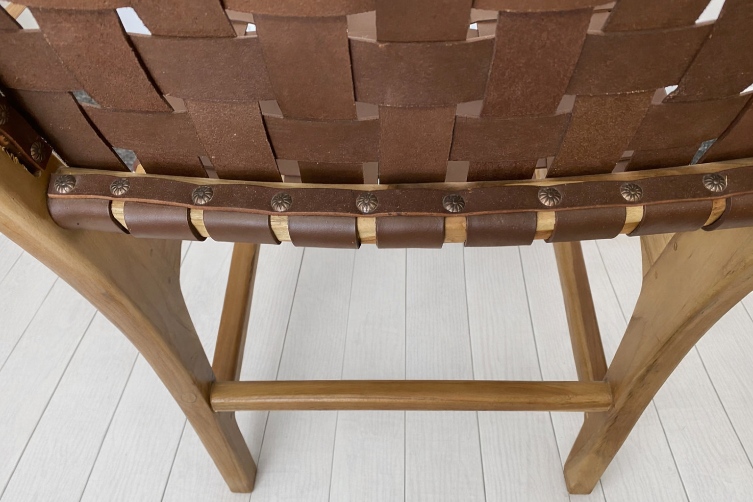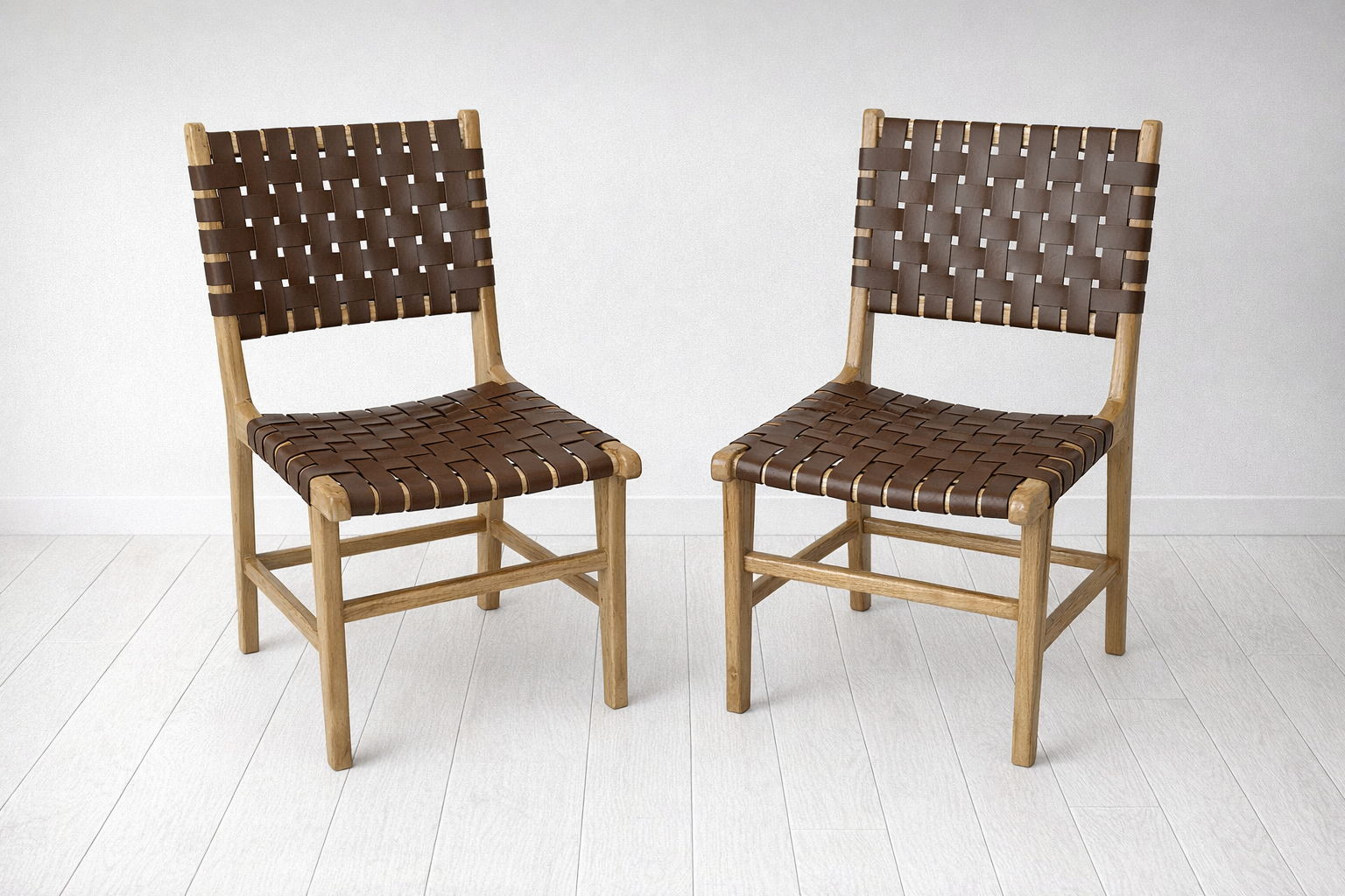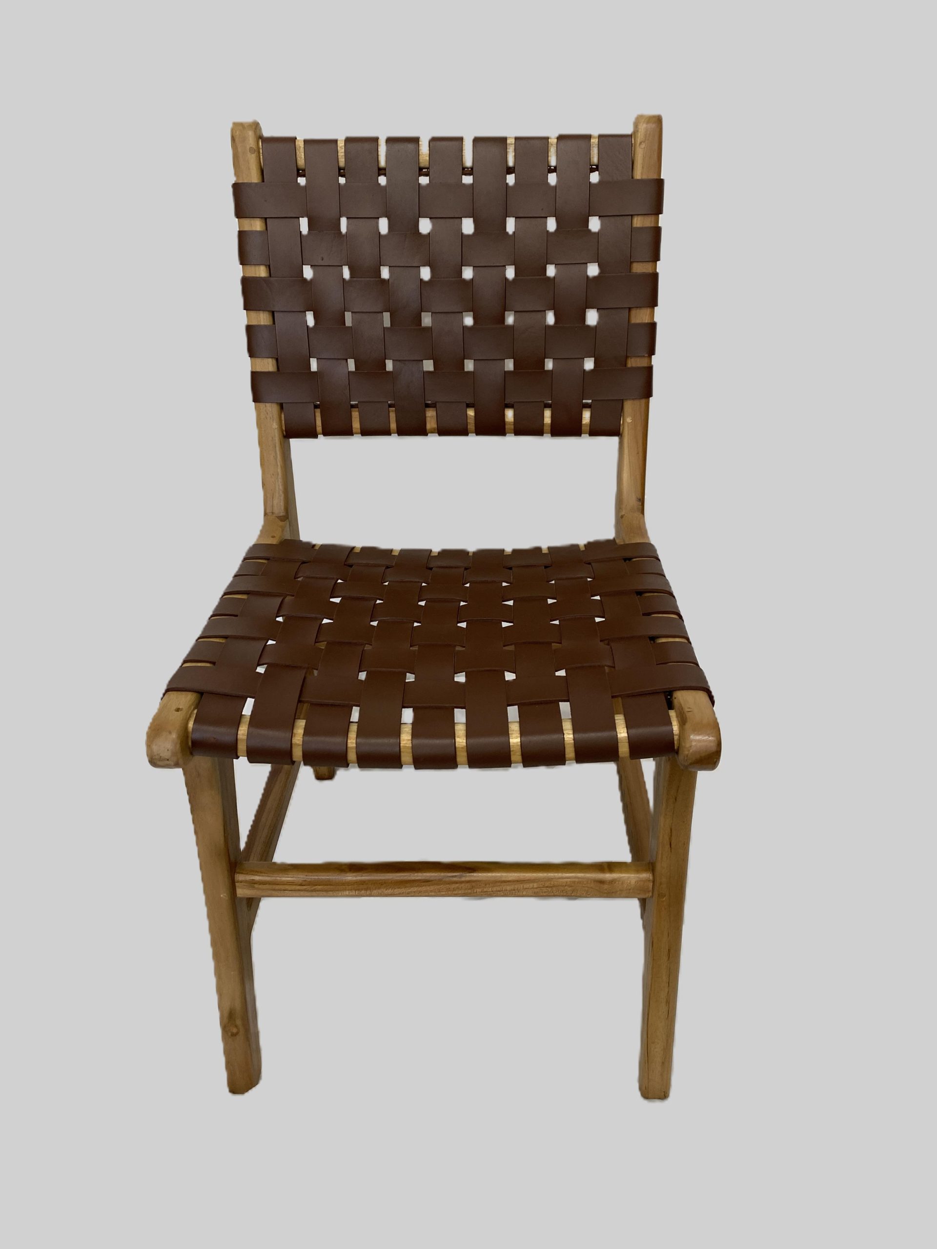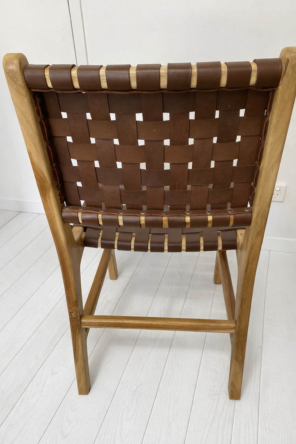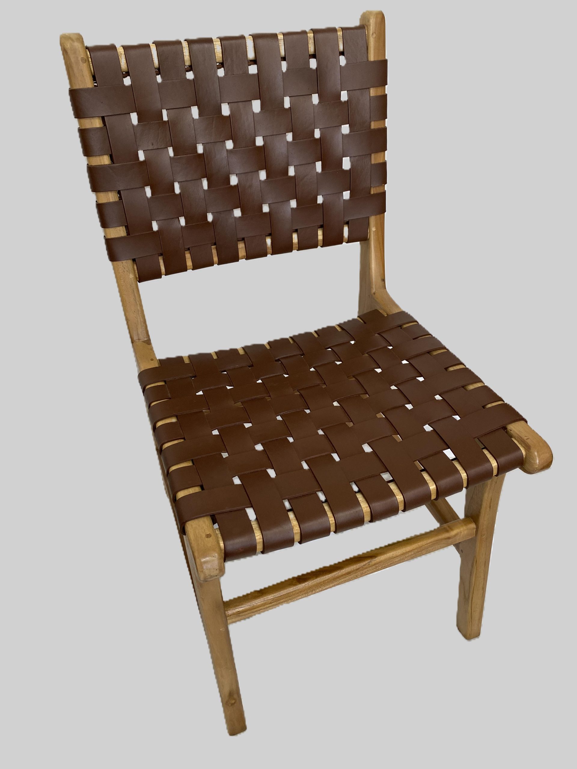 The Diola dining chair is a stylish and sophisticated option for your outdoor or indoor eating areas. Featuring a solid frame of durable teak, it is covered with synthetic dark-tan leather carefully woven into an airy cross-panelled design for strength.